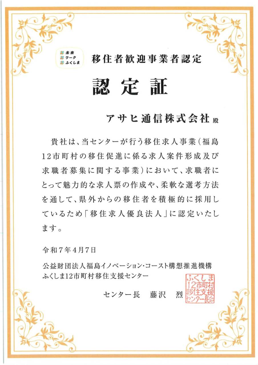 移住者歓迎事業者に認定されました 2025/04/15 移住者歓迎事業者に認定されました 福島イノベーション・コースト構想推進機構より 県外からの移住者を積極的に採用している事業所として認定を受けました。 今後も、移住者のみならず様々な求職者の方々にとって 魅力的な事業所となるよう精進してまいります。