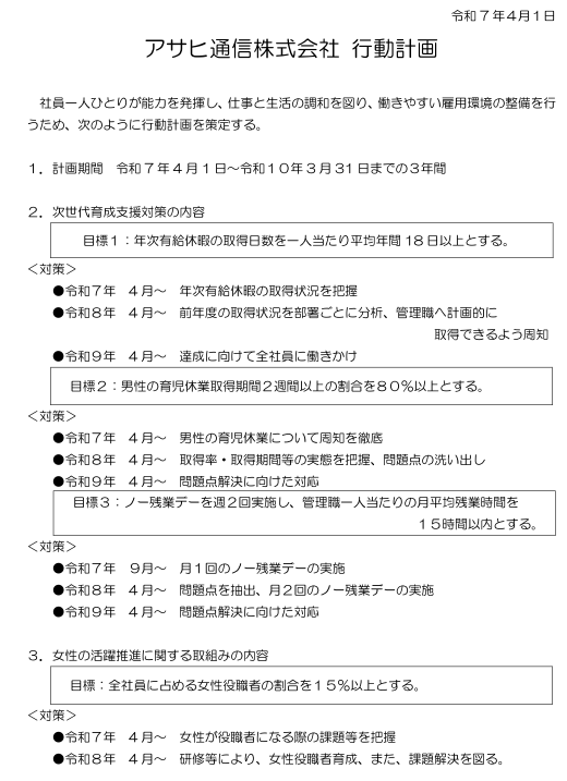 次世代育成支援対策推進法に基づく一般事業主行動計画策定について 2025/04/01 次世代育成支援対策推進法に基づく一般事業主行動計画策定について アサヒ通信では、次世代育成支援対策推進法に基づく一般事業主行動計画を以下の通り策定いたしました。